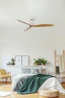 De Faro Barcelona Just Fan M plafondventilator maakt jouw woning aangenaam koel tijdens warme zomerdagen. Deze industriële en moderne plafondventilator heeft een matwit metalen frame en de drie houtkleurige bladen. Met een
